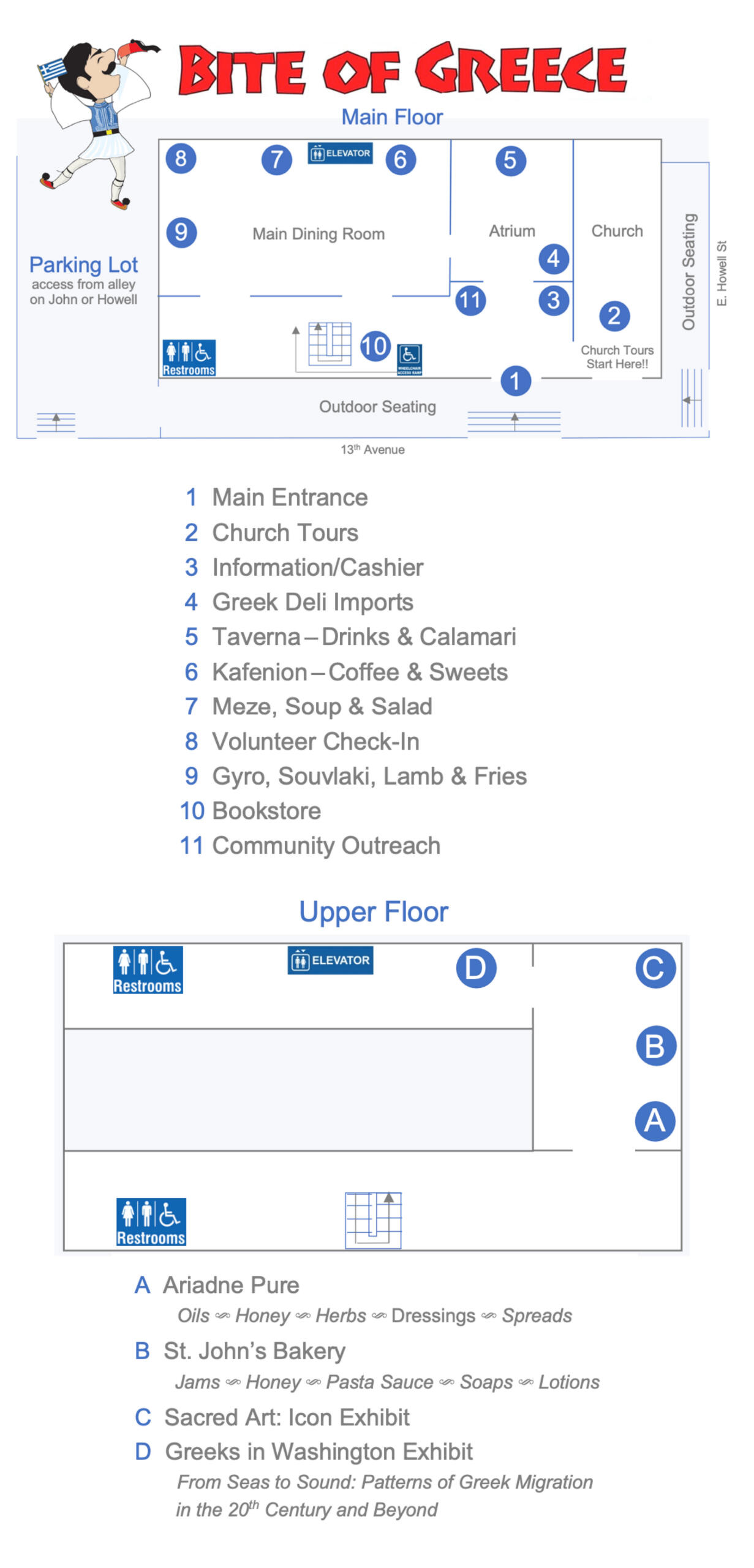 The Bite of Greece is a 3-day festival featuring traditional street-style lunch and dinner, handmade Greek pastries, crafts and imported deli items for sale in the marketplace.